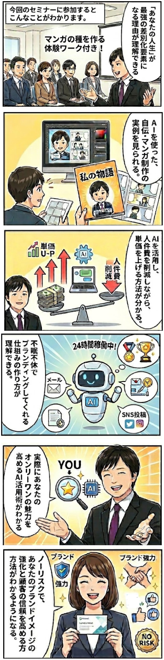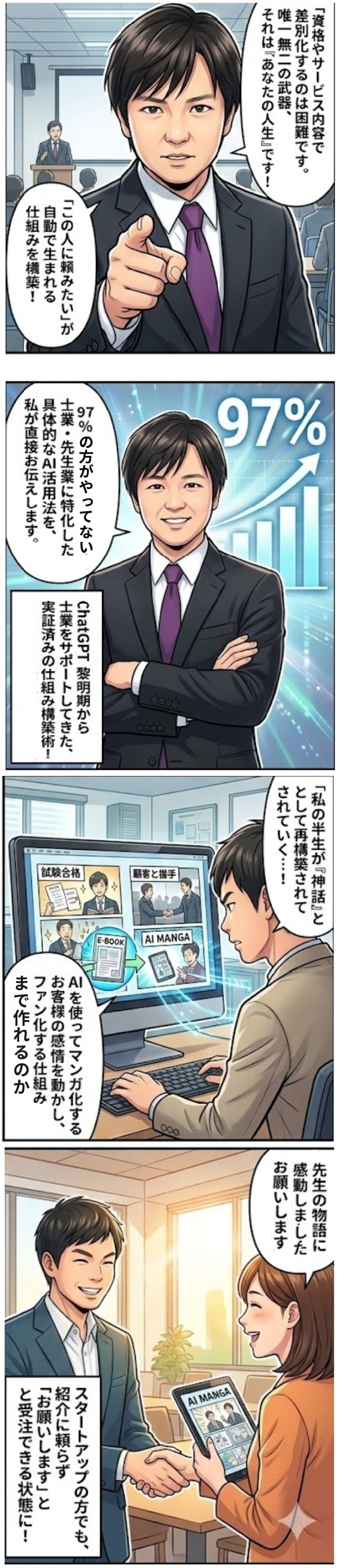 多くの士業・専門家が「差別化」に悩んでいます。しかし、資格やサービス内容で差別化するのは困難です。唯一無二の差別化要素、それは「あなたの人生」です。本セミナーでは、あなたの半生を「神話」として再構築し、AIを使って「電子書籍」や「マンガ」にすることで、お客様の感情を動かし、ファン化する仕組みの作り方を教えます。