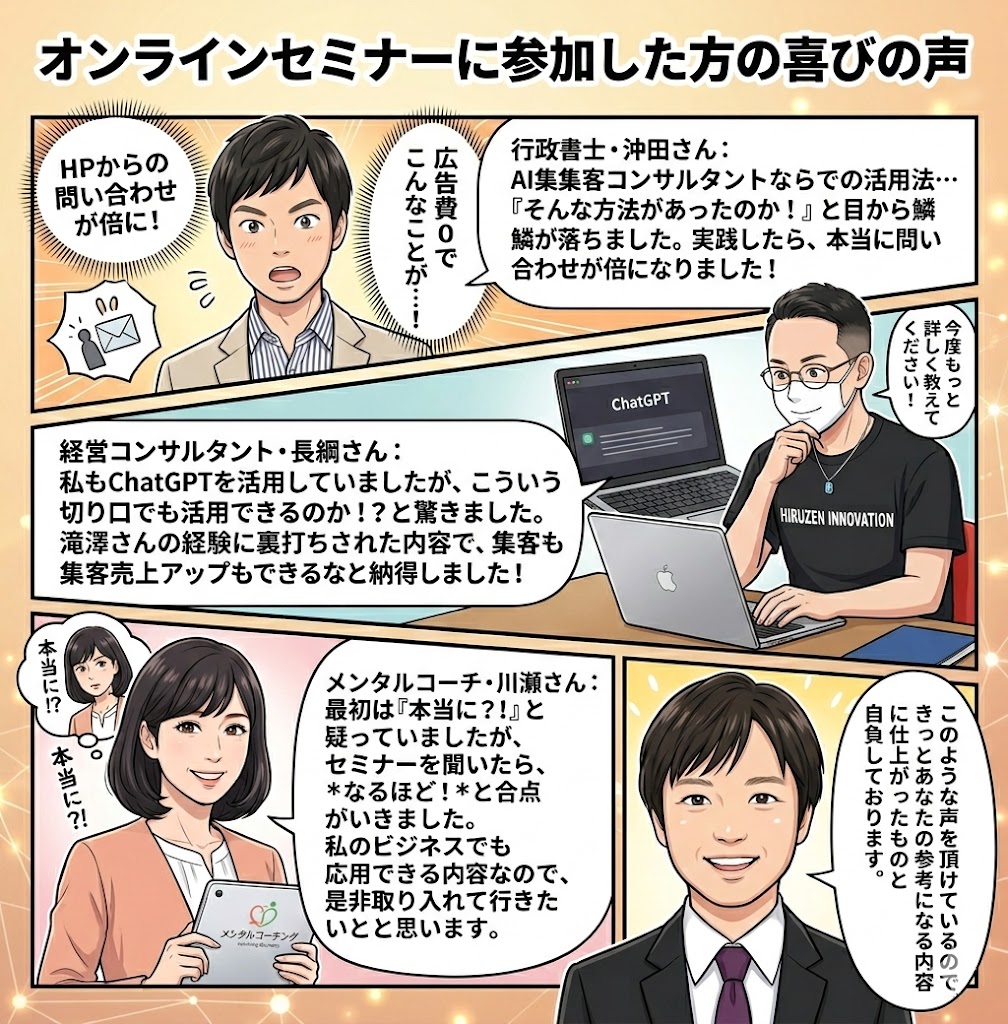 ですが、私はChatGPTが出始めて以来、士業や先生業をずっとAIコンサルという形でサポートしてきてきました。だからこそ、ChatGPTも士業や先生業に特化した、使い方や活用方法をいち早く研究して、成果を上げました。今回、その方法をお伝えしていきたいと思います。